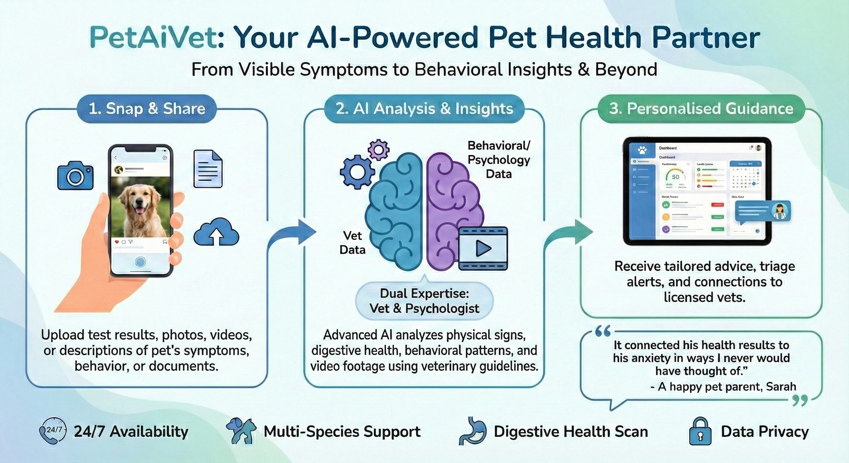 We provide a 360-degree view of your pet's health. Our AI utilizes a hybrid knowledge base of veterinary medicine and animal psychology to deliver truly comprehensive care guidance.